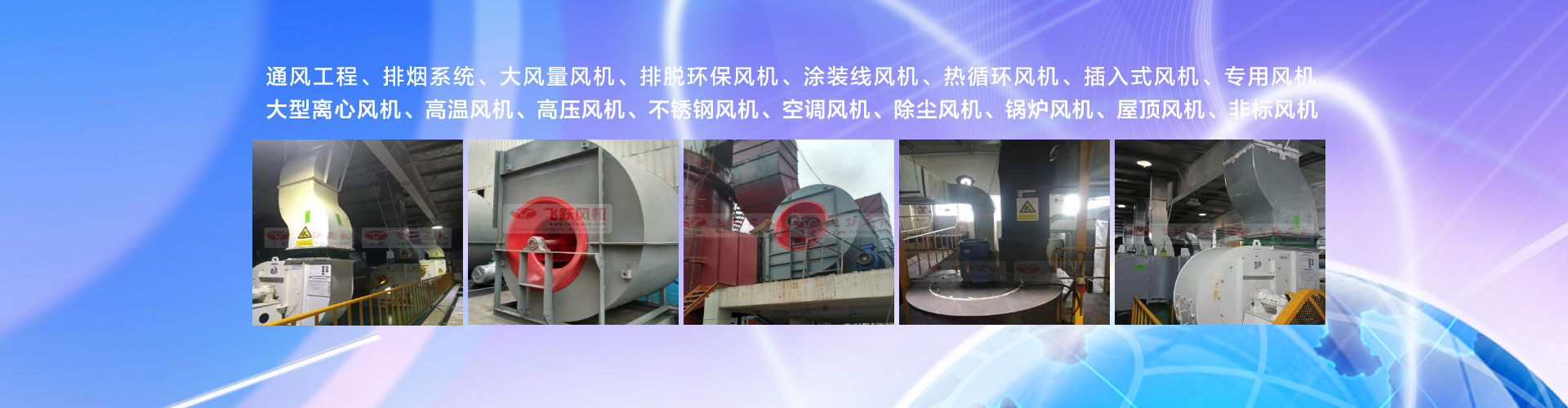 主要產(chǎn)品有:高溫風(fēng)機(jī)、高壓風(fēng)機(jī)、熱循環(huán)風(fēng)機(jī)、鍋爐風(fēng)機(jī)、除塵風(fēng)機(jī)、不銹鋼風(fēng)機(jī)、輸送風(fēng)機(jī)、屋頂風(fēng)機(jī)、紡織風(fēng)機(jī)、空調(diào)風(fēng)機(jī)、專用風(fēng)機(jī),非標(biāo)風(fēng)機(jī)等品種齊全。“精特靈”系列風(fēng)機(jī)產(chǎn)品,以優(yōu)良的性能,卓越的品質(zhì)獲得了廣大用戶的廣泛好評(píng)。